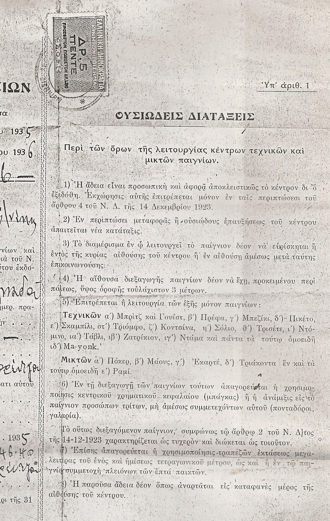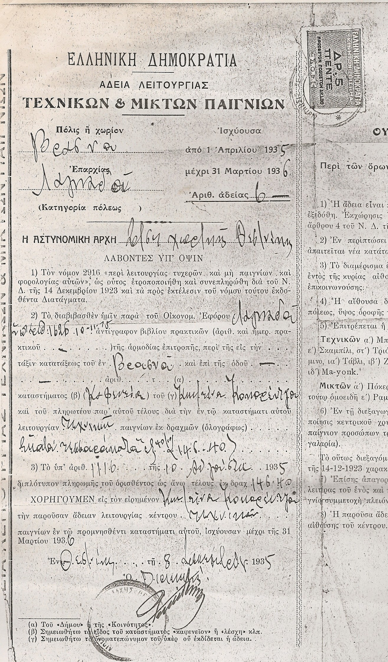 Καφενείον Κοκορέντζα… «Αδεια λειτουργίας ΤΕΧΝΙΚΩΝ κ ΜΙΚΤΩΝ ΠΑΙΓΝΙΩΝ» του 1935
