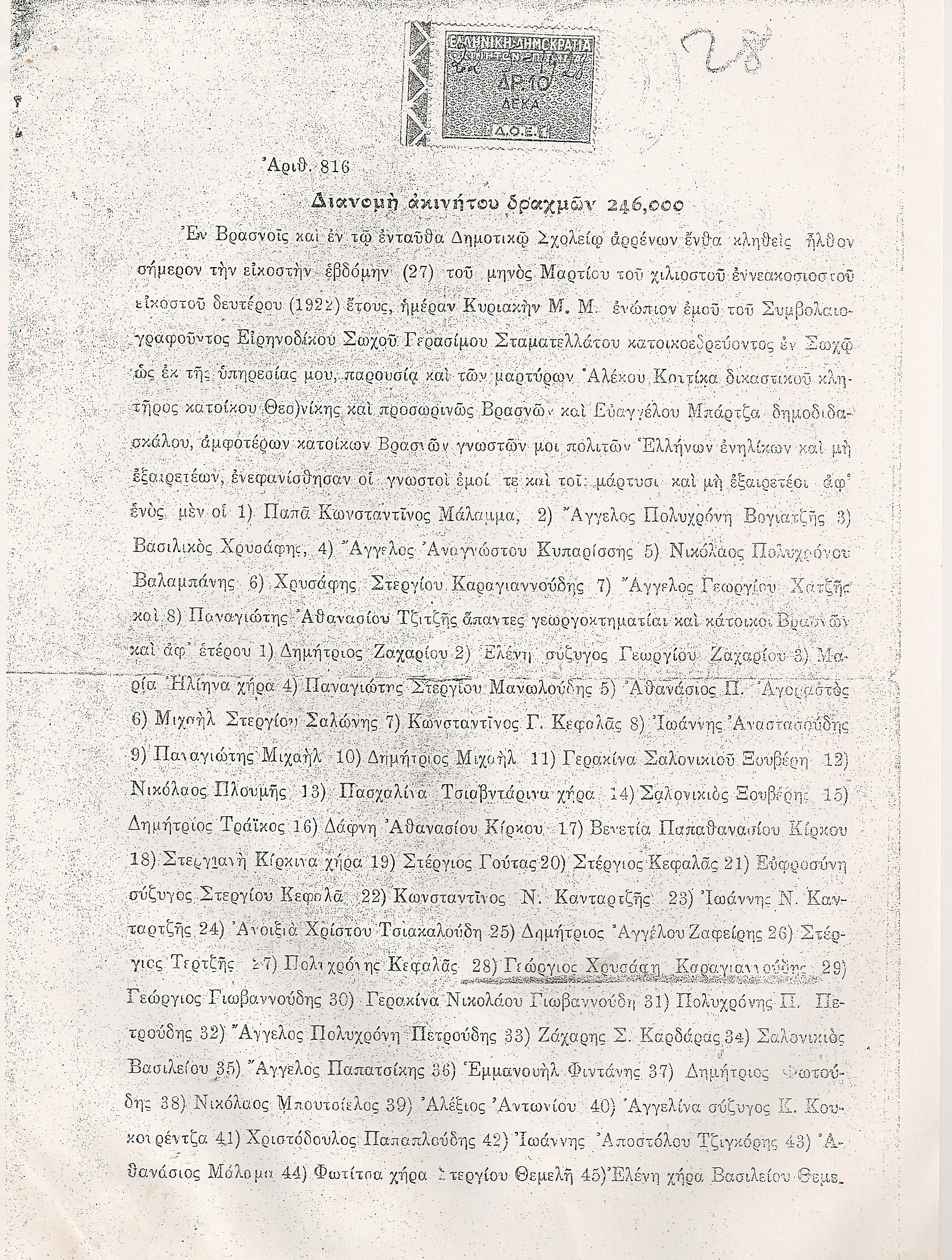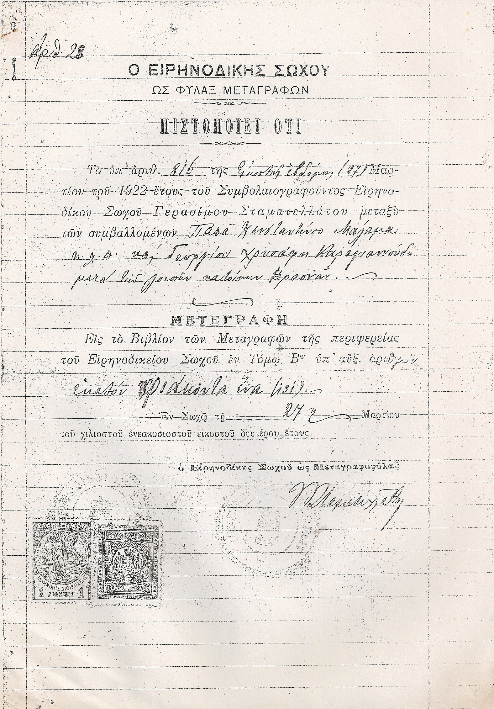 Το συμβόλαιο «816» του 1922 (Ειρηνοδικείο Σωχου, Γερασ. Σταματελλατος)