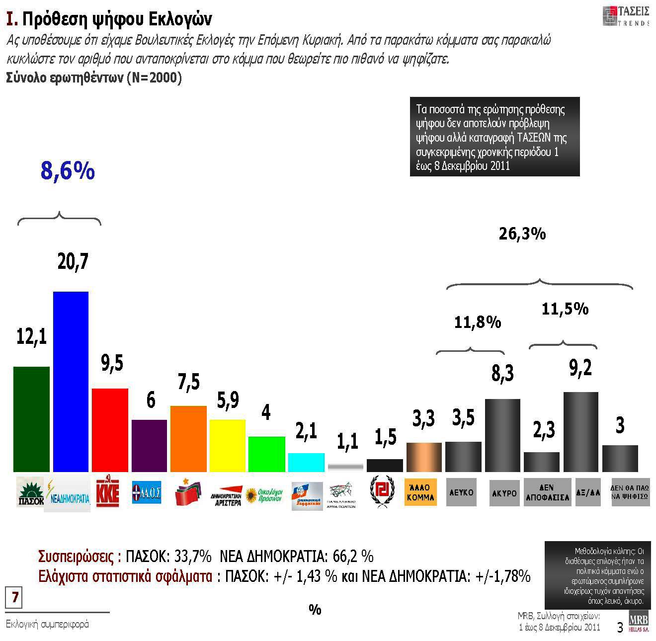 Στην πρόθεση ψήφου, σύμφωνα με τις εξαμηνίαιες τάσεις της MRB, η Νέα Δημοκρατία συγκεντρώνει ποσοστό 20,7%, το ΠΑΣΟΚ 12,1%, το ΚΚΕ 9,5%, ο ΣΥΡΙΖΑ 7,5%, ο ΛΑ.Ο.Σ. 6%, η Δημοκρατική Αριστερά 5,9%, Οικολόγοι Πράσινοι 4%, η Δημοκρατική Συμμαχία 2,1%, η Χρυσή Αυγή 1,5% το Άρμα Πολιτών 1,1%, άλλο κόμμα απαντά το 3,3%, Λευκό – αποχή το 11,8% και αδιευκρίνιστη είναι η ψήφος…