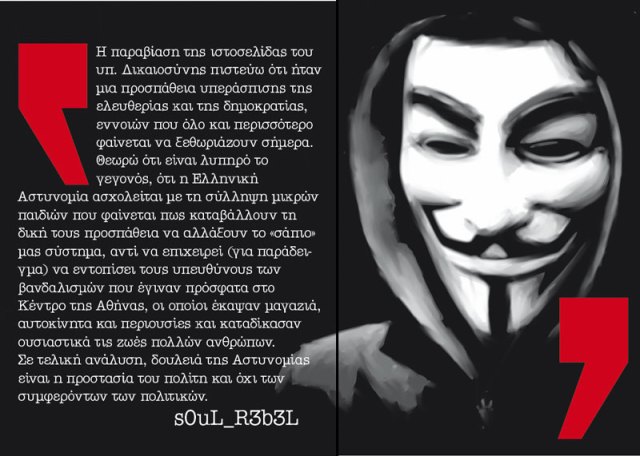 Για πρώτη φορά μέλη του ελληνικού βραχίονα της παγκόσμιας οργάνωσης των χ-ακτιβιστών μιλούν στον Τύπο. Ρίχνουν το «γάντι» στην ΕΛ.ΑΣ. γιατί επιδίδεται στο κυνήγι νεαρών χάκερ και σκιαγραφούν το ιδεολογικό στίγμα των συντρόφων τους, κρατώντας αποστάσεις από τους ταραχοποιούς, που προκάλεσαν καταστροφές στο κέντρο της Αθήνας