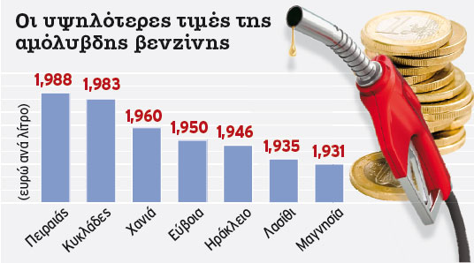 Τα 1,988 ευρώ το λίτρο έφτασε η τιμή της απλής αμόλυβδης στον Πειραιά. Πάνω από τα 1,95 ευρώ πωλείται σε Κυκλάδες, Χανιά και Εύβοια. Αλμα στα 123 δολάρια το βαρέλι πραγματοποίησε χθες το πετρέλαιο μπρεντ