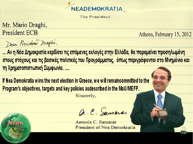 Πότε έλεγε ψέματα ο κ. Σαμαράς; Στον ελληνικό λαό όταν προχθές ανακοίνωνε τα 18 μέτρα ή στον κ. Ντράγκι, όταν του έστελνε στις 15 Φεβρουαρίου 2012, την επιστολή που παραθέτουμε αυτούσια, με φαρδιά – πλατιά την δεσμευτική υπογραφή του; Διότι μνημόνιο και παροχές είναι αντίθετα.