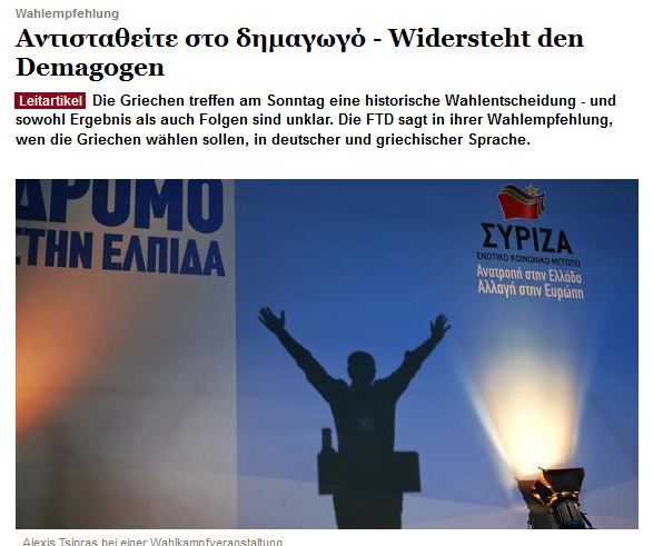 Σε μια πρωτοφανή κίνηση τους, που δεν έχει κανένα ιστορικό προηγούμενο, οι FINANCIAL TIMES DEUTSCHLAND, έγραψαν πρωτοσέλιδο άρθρο στα ελληνικά, με το οποίο καλούν τον ελληνικό λαό (;) να αντισταθεί στη δημαγωγία του Τσίπρα και του ΣΥΡΙΖΑκαι να ψηφίσει τη ΝΔ !