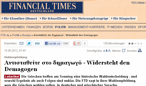 Σύσταση προς τους ψηφοφόρους – Η Financial Times Deutschland (FTD) και η πλειοψηφία των Ελλήνων έχουν ένα κοινό συμφέρον: Η χώρα σας πρέπει να παραμείνει στο ευρώ. Την Κυριακή γίνονται ιστορικές εκλογές, οι οποίες θα είναι καθοριστικές ακριβώς επ’ αυτού, αλλά και για το μέλλον της Ευρωπαϊκής Νομισματικής Ένωσης. Γι’ αυτό η FTD κάνει σήμερα κατ’ εξαίρεση μία σύσταση στους Έλληνες ψηφοφόρους, κάτι που συνηθίζει πριν τις εκλογές για το Ομοσπονδιακό Κοινοβούλιο και για το Ευρωκοινοβούλιο. Αγαπητές Ελληνίδες, αγαπητοί Έλληνες, φροντίστε για ξεκάθαρες πολιτικές συνθήκες. Ψηφίστε θαρραλέα υπέρ της μεταρρυθμιστικής πορείας και όχι οργισμένα κατά της αναγκαίας και επίπονης αναδιάρθρωσης. Μόνο με τα κόμματα που αποδέχονται τους όρους των διεθνών χρηματοδοτών, η χώρα σας θα μπορέσει να παραμείνει στο ευρώ. Αντισταθείτε στη δημαγωγία του Αλέξη Τσίπρα και του ΣΥΡΙΖΑ. Μην εμπιστεύεστε τις υποσχέσεις τους, ότι δηλαδή είναι δυνατή η χωρίς συνέπειες καταγγελία όλων των συμφωνιών. Η χώρα σας έχει επιτέλους ανάγκη από ένα κράτος που λειτουργεί. Για την ομαλή διακυβέρνησή της συνιστούμε τη Νέα Δημοκρατία, κάτι που κάνουμε με βαριά καρδιά. Η Νέα Δημοκρατία άσκησε επί δεκαετίες λάθος πολιτική και είναι συνυπεύθυνη για τη σημερινή μιζέρια. Παρ’ όλα αυτά η καλύτερη επιλογή για τη χώρα σας θα ήταν μία κυβέρνηση συνασπισμού με αρχηγό τον Αντώνη Σαμαρά και όχι τον Αλέξη Τσίπρα, ο οποίος θέλει να γυρίσει πίσω τον τροχό της ιστορίας και σας βαυκαλίζει με έναν κόσμο που είναι εκτός πραγματικότητας.