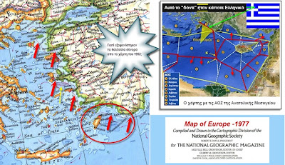 Ο χάρτης της φωτογραφίας έχει εκδοθεί απο τη National Geographic Society των HΠΑ, για το διεθνώς αναγνωρισμένο περιοδικό Τhe National Geographic Magazine. Παρατηρείστε τη διασυνοριακή γραμμή με κόκκινο διακεκομμένο χρώμα που υπάρχει στον χάρτη αυτόν, που ξεκινάει απο τον Εβρο και φτάνει μέχρι το Καστελόριζο. Αυτή η γραμμή είναι συμβατή με τις διεθνείς συνθήκες, που αφορούσαν την Ελλάδα και την Τουρκία ως το 1977 (παρατηρείστε, τα σημεία που δείχνουν τα κόκκινα βέλη – κάνετε κλίκ στη φωτογραφία).