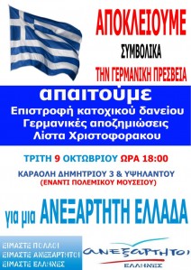 Οι ΑΝΕΞΑΡΤΗΤΟΙ ΕΛΛΗΝΕΣ καλούμε όλους του Έλληνες πολίτες σε παράσταση διαμαρτυρίας στην Γερμανική Πρεσβεία (Καραολή Δημητρίου 3 & Υψηλάντου, απέναντι από το Πολεμικό Μουσείο) την Τρίτη 9 Οκτωβρίου 2012 και ώρα 18:00 για να διατρανώσουμε μπροστά στην Γερμανίδα Καγκελάριο κα Α. Μέρκελ την αντίθεσή μας στην μετατροπή της Χώρας σε γερμανικό προτεκτοράτο.
