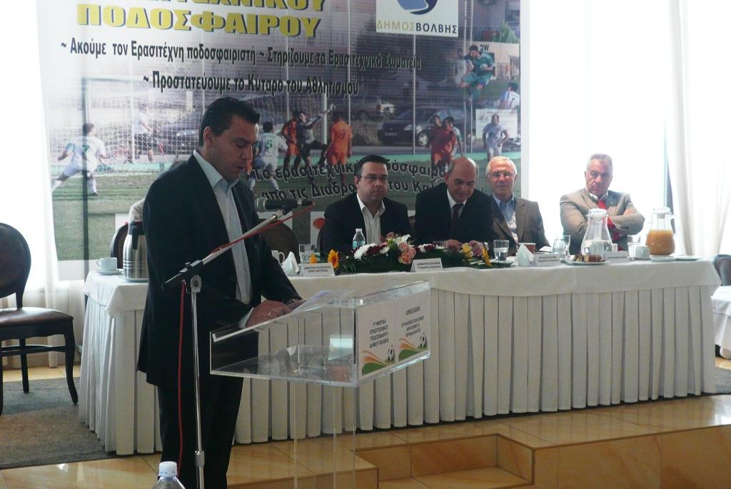 Στην ομιλία του ο δήμαρχος Βόλβης Δημήτρης Γαλαμάτης τόνισε ότι το ερασιτεχνικό ποδόσφαιρο εκτός από τις δυο σημαντικές προσφορές του ως μέσο αποτροπής της νεολαίας από βλαβερές συνήθειες και ως κύτταρο ανάπτυξης του αθλητισμού και του ποδοσφαίρου ειδικότερα, σήμερα αποκτά και μια τρίτη αποστολή: «να διατηρήσει την κοινωνική συνοχή στα χωριά, κρατώντας ενωμένο τον κοινωνικό ιστό γύρω από τον πυρήνα της ομάδας». Αναφέρθηκε ιδιαίτερα στις στρεβλώσεις του παρελθόντος από την πλευρά της αυτοδιοίκησης, με τις επιλεκτικές χρηματοδοτήσεις ομάδων , που οδήγησε πολλές φορές σε μια άτυπη συναλλαγή, όπου ο δήμαρχος έδινε λεφτά και το σωματείο ανταπέδιδε με ψήφους. «Πρέπει να δώσουμε μάχες», σημείωσε, «ώστε να σπάσει το δίκτυο της συναλλαγής και να διαμορφώσουμε ένα νέο πλαίσιο μέσα στις υπάρχουσες δυσμενείς οικονομικές συνθήκες, όπου ο δήμος μπορεί α) να παρέχει διευκόλυνση στη μετακίνηση των αθλητών, β) να ενισχύσει τις ευρηματικότητες, γ) να συντηρεί τους αθλητικούς χώρους και δ) να αξιοποιήσει-ενεργοποιήσει τον ανθρώπινο παράγοντα εντός κι εκτός δήμου». Ανέφερε μάλιστα το παράδειγμα δημιουργίας ενός φιλανθρωπικού ταμείου από το χώρο του αθλητισμού με έσοδα από αγώνες βετεράνων ποδοσφαιριστών, όπου υπάρχει ανάγκη.