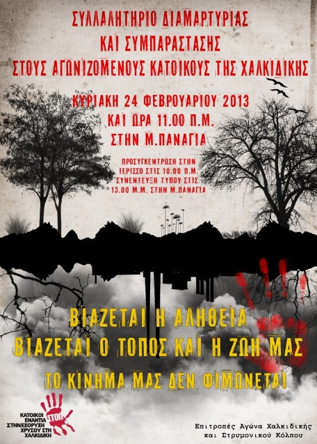 Είμαστε κάτοικοι της Χαλκιδικής, μέλη της τοπικής κοινωνίας από διαφορετικούς πολιτικούς χώρους, με διαφορετικές απόψεις και ιδιαιτερότητες, που μας έχει ενώσει το κοινό μας πρόβλημα και ο κοινός μας αγώνας εδώ και χρόνια και δεν δεχόμαστε να γίνουμε μέρος οποιασδήποτε κομματικής αντιπαράθεσης.Δρώμενα…