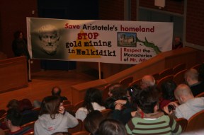 | από την ανάρτηση πανό σε αίθουσα του Φεστιβάλ Ντοκιμαντέρ Θεσσαλονίκης. |