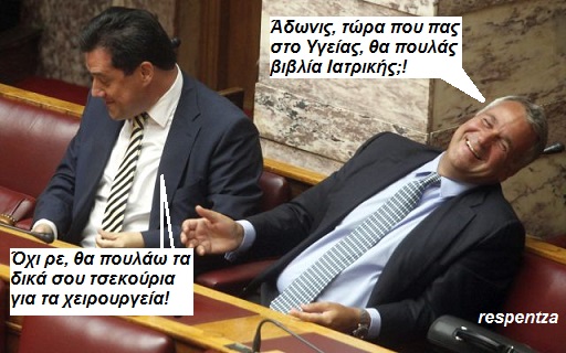 Αυτό το άρθρο δημοσιεύτηκε στο Ανάμια, Σκίτσα, Παραλαλίδις, Γελοιογραφίες, Σάτιρα, Πολιτική γελοιογραφία & σάτιρα, Δικομματική κυβέρνηση (νδ - πασοκ). Αποθήκευσε τον μόνιμο σύνδεσμο.