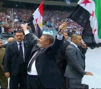 | Ο Πρόεδρος Μοχάμεντ Μόρσι ανεμίζοντας τη σημαία των τρομοκρατών Νατοϊκών μισθοφόρων στη Συρία |