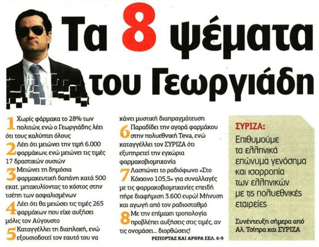Η εφημερίδα τονίζει πως ο ΣΥΡΙΖΑ επιθυμεί τα ελληνικά επώνυμα γενόσημα και ισορροπία των ελληνικών με τις πολυεθνικές εταιρείες, σε τρεις σελίδες μάλιστα παραθέτει απόψεις και στοιχεία εναντίον του υπουργού.Επίσης ο πρόεδρος του ΣΥΡΙΖΑ δίνει σήμερα συνέντευξη με μόνο θέμα την κόντρα που έχει ξεσπάσει με τον υπουργό Υγείας.