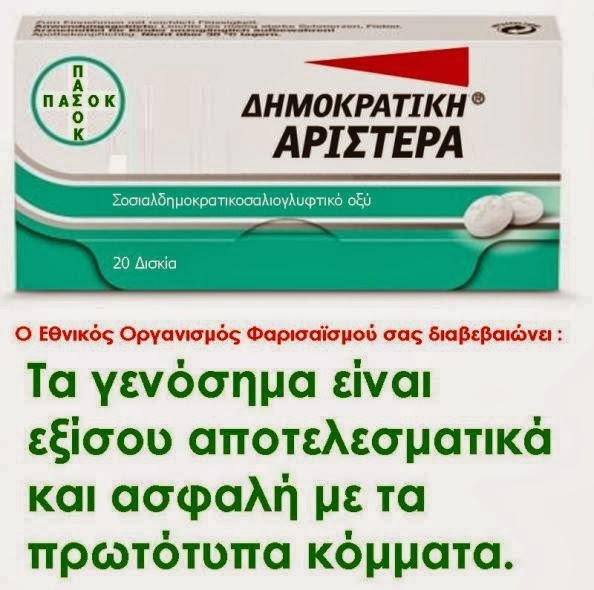 Ευχόμαστε στους συνεπείς ψηφοφόρους του ΠαΣοΚ, της Νέας Δημοκρατίας(;), καθώς και της ΡηΜαδ, από εδώ και μπρος κάθε φορά που θα αρρωσταίνουν τα παιδιά τους και τα εγγόνια τους να τα θεραπεύουν με γενόσημα φάρμακα!