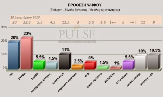 Δημοσκόπηση Pulse: Καθαρό προβάδισμα ΣΥΡΙΖΑ, 3η η Χρυσή Αυγή με διπλάσιο ποσοστό από το 4ο ΠΑΣΟΚ