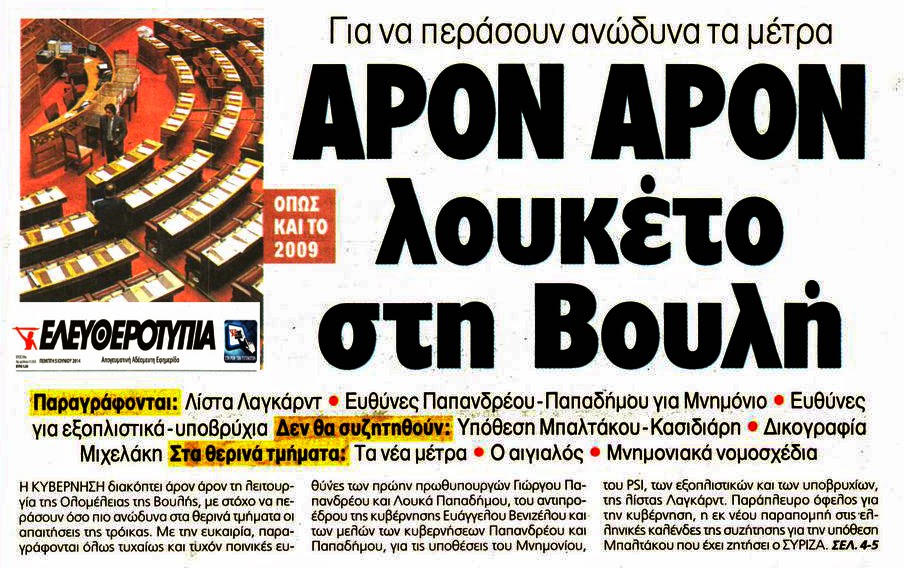 H KYBEPNHΣH διακόπτει άρον άρον τη λειτουργία της Oλομέλειας της Βουλής, με στόχο να περάσουν όσο πιο ανώδυνα στα θερινά τμήματα οι απαιτήσεις της τρόικας. Με την ευκαιρία, παραγράφονται…