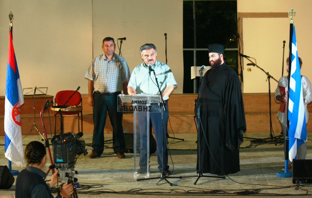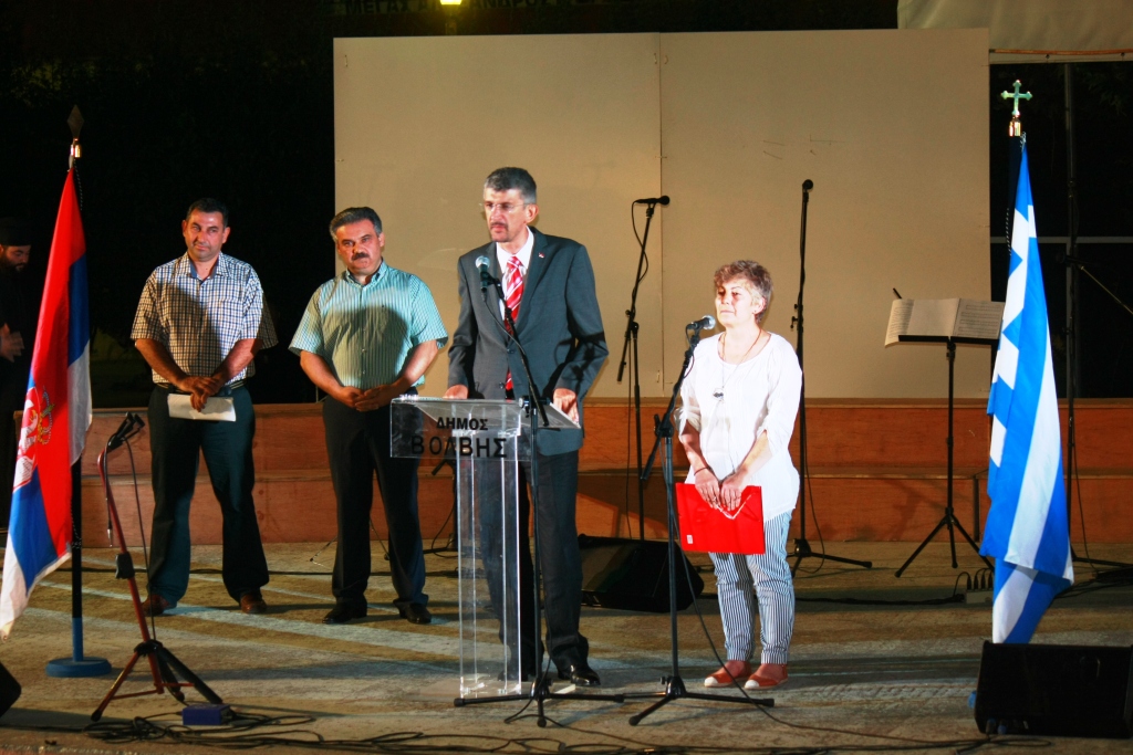 Μίλησε ιδιαίτερα για τους δεσμούς που συνδέουν το δήμο Βόλβης και τους κατοίκους του με τον σέρβικο λαό. Για την παρουσία των χιλιάδων Σέρβων τουριστών κάθε χρόνο, πολλοί εκ των οποίων παρακολούθησαν την εκδήλωση καθώς υπήρχε παράλληλη μετάφραση στα σέρβικα. Για τους προσωπικές σχέσεις πολλών κατοίκων με Σέρβους, για τη συνεργασία του δήμου Βόλβης με τους δήμους Κρούσεβατς και Νις, αλλά και τις διπλωματικές αρχές της Σερβίας στη χώρα μας, για την έμπρακτη έκφραση αλληλεγγύης που εκδηλώθηκε πρόσφατα με την αποστολή ανθρωπιστικής βοήθειας στους Σέρβους πλημμυροπαθείς.