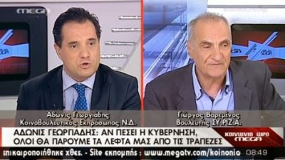 Προτρέπει να πάρει ο κόσμος τα λεφτά του από τις τράπεζες, ο Αδ. Γεωργιάδης, από την πρωινή ζώνη του Mega. Προτροπή σε άδειασμα των τραπεζών από χρήματα, καλώντας ακόμα και τους δημοσιογράφους της εκπομπής να αποσύρουν τα χρήματά τους από τις τράπεζες σε περίπτωση που πέσει η κυβέρνηση και βγει ο ΣΥΡΙΖΑ.