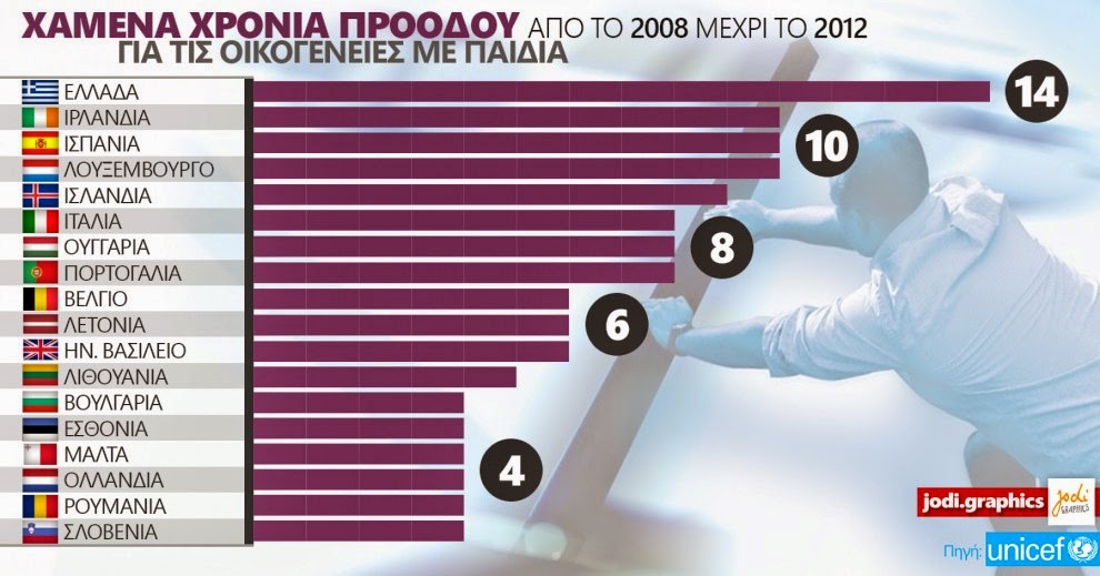 Στις εικονιζόμενες για παράδειγμα έρευνες φαίνεται πως στην Ελλάδα, οι οικογένειες με παιδιά έχασαν το ισοδύναμο 14 ετών εισοδηματικής προόδου, πρώτη μεταξύ των πρώτων,