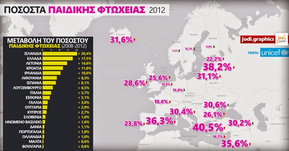 ..και πως με βάση τημεταβολή στην παιδική φτώχεια με έτος βάσης το 2008 η Ελλάδα καταλαμβάνει την 2η θέση παρουσιάζοντας επιδείνωση κατά 17,5 ποσοστιαίες μονάδες (από 23% το 2008 σε 40,5% το 2012).
