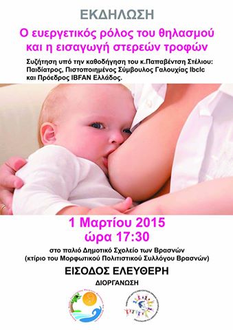 Η Εθελοντική Ομάδα Μητρικού Θηλασμού και Μητρότητας Χαλκιδικής, η οποία ανήκει στο Πανελλήνιο Δίκτυο Εθελοντικών Ομάδων Μητρικού Θηλασμού και Μητρότητας σας προσκαλεί στη συνάντηση για ανταλλαγή απόψεων και ενημέρωση με θέμα : » Ο ευεργετικός ρόλος του θηλασμού και η εισαγωγή στερεών τροφών» με την συμμετοχή και καθοδήγηση του κ. Παπαβεντσή Στέλιου : Παιδίατρος, Πιστοποιημένο Σύμβουλο Γαλουχίας Ibclc και Πρόεδρος IBFAN Ελλάδος. Στις 01 Μαρτίου 2015 και ώρα 17:30 στο παλιό Δημοτικό Σχολείο των Βρασνών (κτήριο του Μορφωτικού Πολιτιστικού Συλλόγου Βρασνών).Δρώμενα…