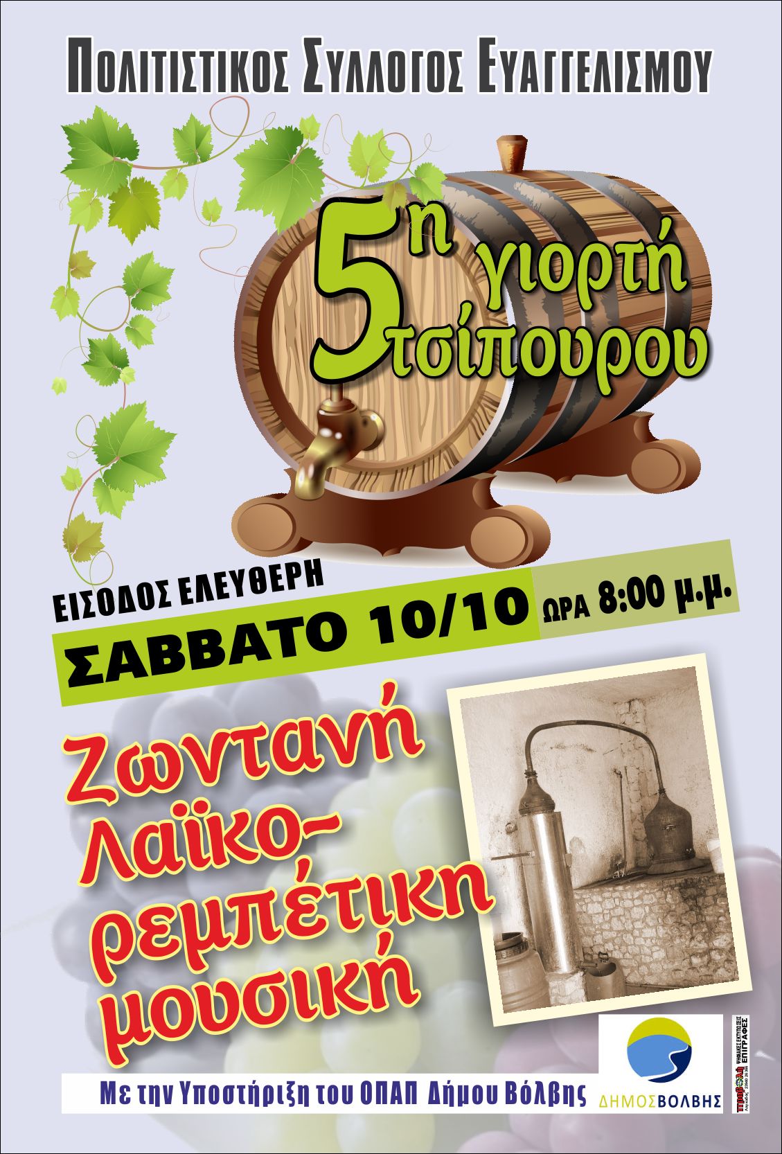 Η 5η Γιορτή Τσίπουρου, προσφέρει δωρεάν το ντόπιο φημισμένο απόσταγμα, που παράγεται με παραδοσιακό τρόπο από γενιά σε γενιά, μεταφέροντας τα δικά του μυστικά. Οι επισκέπτες μπορούν να απολαύσουν το παραδοσιακό τσιπουράκι, συνοδεία μουσικής από ορχήστρα, με λαϊκό και ρεμπέτικο πρόγραμμα.