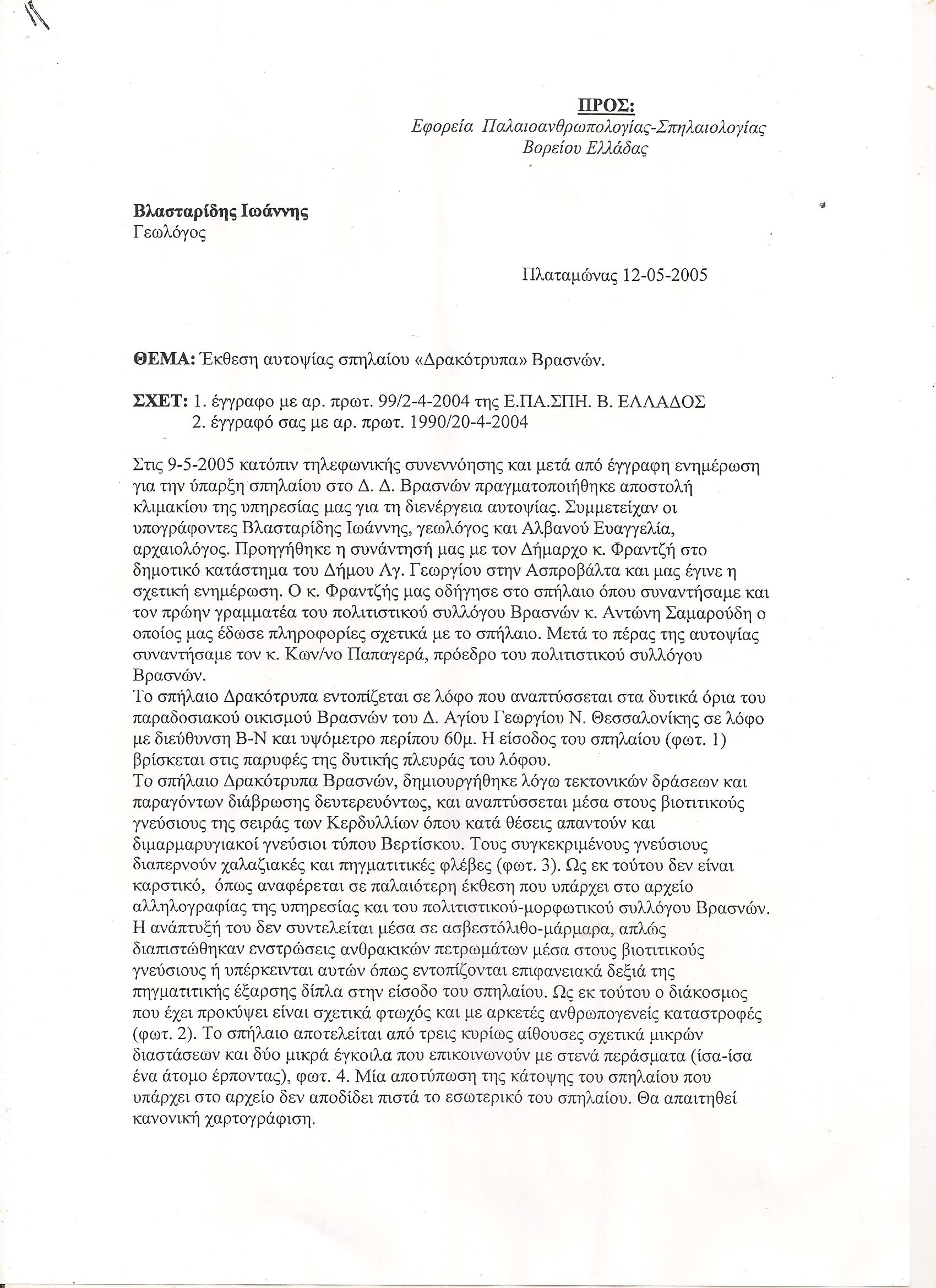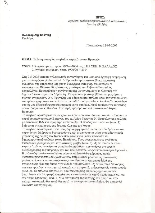 Εφορεία Παλαιοανθρωπολογίας – Σπηλαιολογίας Βόρειας Ελλάδος: Αναφορά αυτοψίας στο σπήλαιο Βρασνών «Δρακότρυπα» (2005)